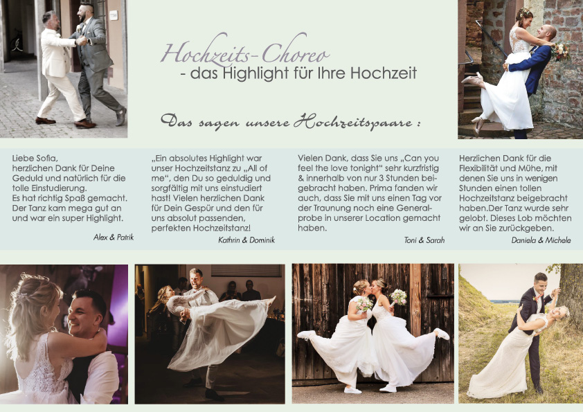 Für Ihre Hochzeit bieten wir als Special eine individuelle Einstudierung, entsprechend Ihrer Musikwünsche. Vom klassischen Walzer bis zur Showhochzeit setzen wir Ihre Vorstellungen um und geben Ihrem Hochzeitstagstag eine ganz besondere Note.